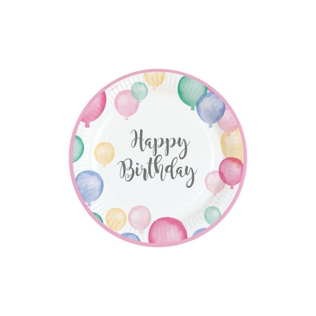 Papírové talíře s nápisem Happy Birthday na narozeninové party a oslavy. Spolu s ostatními produkty naší Pastel Balloons party vytvoříte jednotnou a krásnou dekoraci a výzdobu vaší akce. Velikost: 23 cm. Balení: 8 ks.Doplňkové parametry