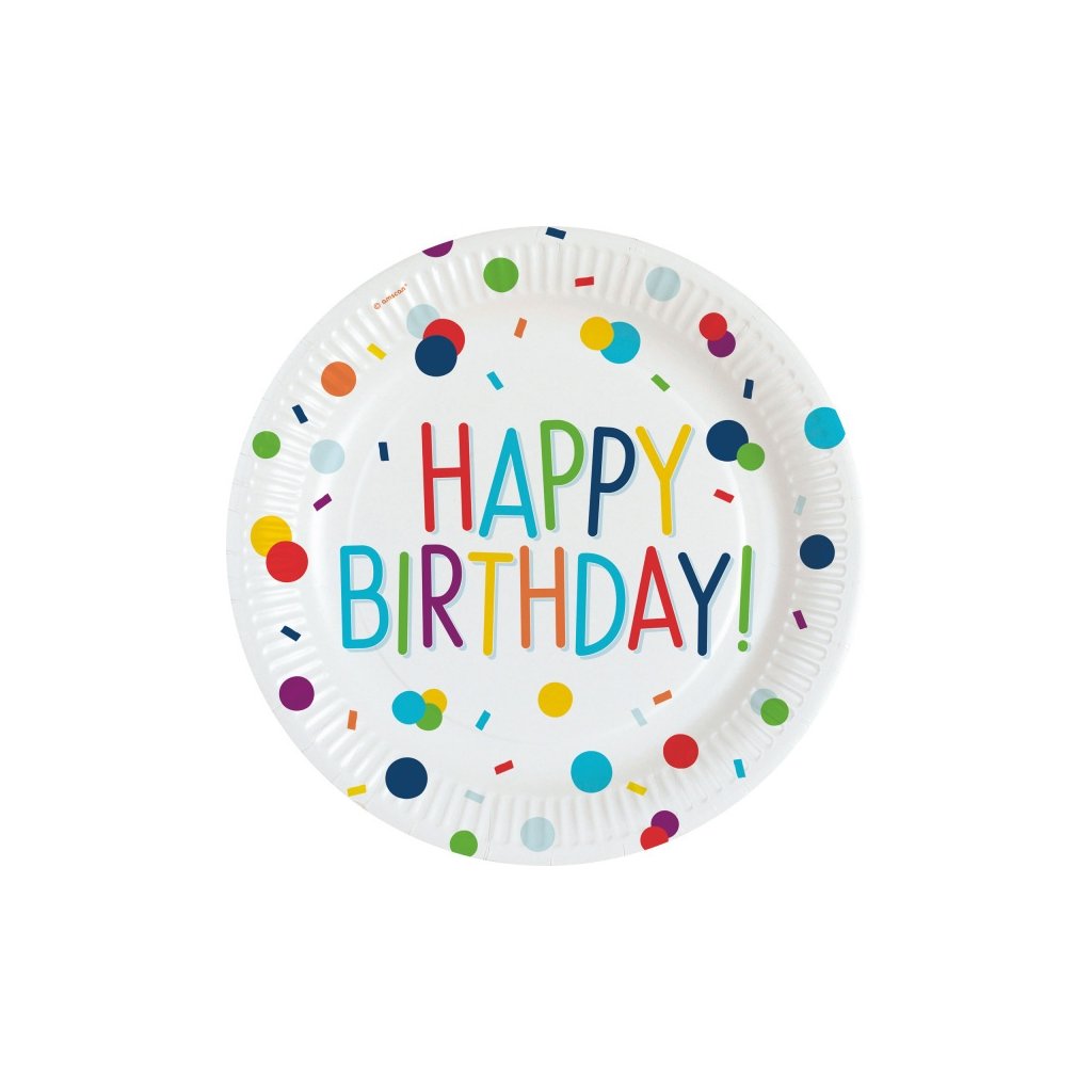 Papírové talíře s motivem konfet a nápisem Happy Birthday jsou skvělou volbou na tématické party nebo oslavy narozenin. Možnost kombinace s dalšími produkty s puntíčky jako balonek, ubrus, atd. Velikost: 23 cm. Balení: 8 ks.Doplňkové parametry