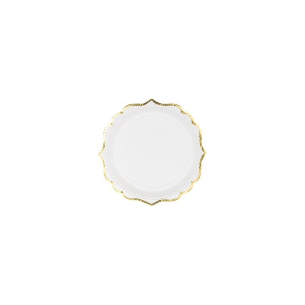Luxusní papírové talířky v bílé barvě se zlatým okrajem, budou nepostradatelným doplňkem každé oslavy narozenin, tématické party nebo zahradní oslavy s grilováním. Jsou také velmi praktické, talíře po použití jednoduše ekologicky zlikvidujete, bez nutnosti mytí. Vhdoné do kombinace s kelímky stejného vzoru. Velikost: 18,5cm Počet: 6 ks.Doplňkové parametry