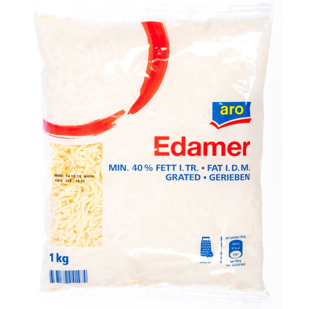 - Edam strouhaný, sýr. Tuk v sušině 40 %. Obsah sušiny min. 53 %. Baleno v ochranné atmosféře.