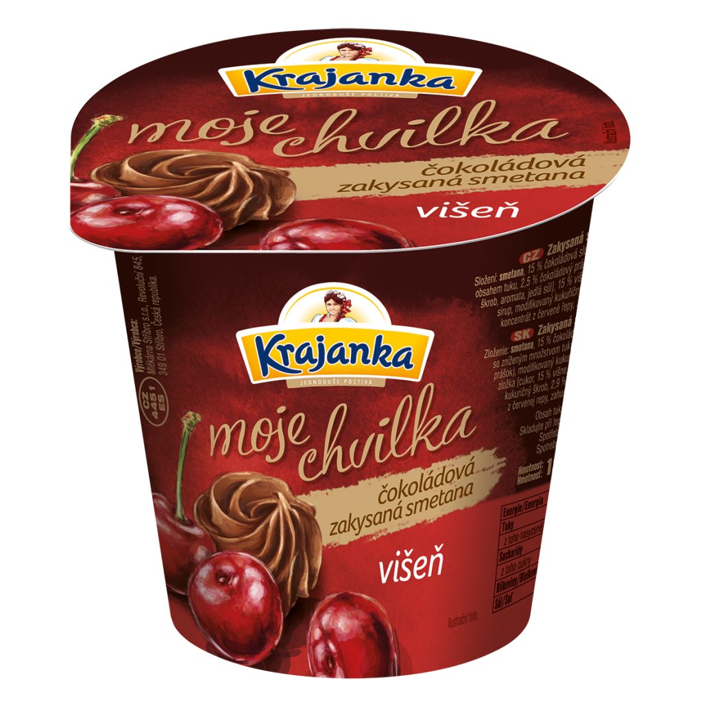 - SMETANA, 15% čokoládová složka [cukr, voda, 8,2% kakaový prášek se sníženým obsahem tuku, 2,5% čokoládový prášek (cukr, kakaový prášek), modifikovaný škrob, aromata, 0,1% čokoláda (kakaová hmota, cukr, kakaové máslo, emulgátor: slunečnicový lecitin; přírodní vanilkové aroma), jedlá sůl], 15% višňová složka [cukr, 15% višně, modifikovaný škrob, 2,9% višňový koncentrát, aromata, koncentrát z červené řepy, zahušťovadlo: pektiny], smetanová kultura.