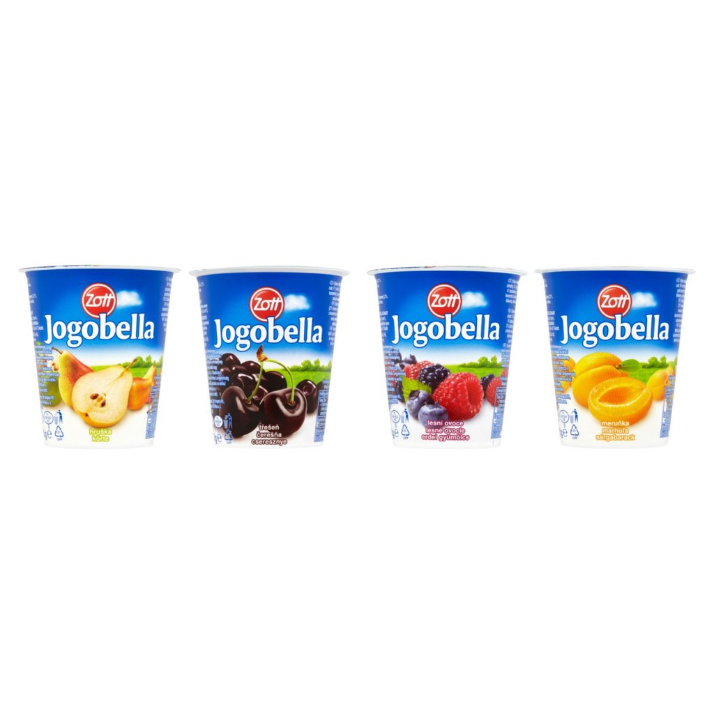 - mléko, 18% ovocná složka (cukr, 17% ostružiny, 13% jahody, 6% maliny, 5% bezinky, 4% borůvkové pyré*, 3% borůvky, 2% bezinková šťáva*, barvící koncentrát z karotky, aronie a hroznů; aroma), cukr, mléčné bílkoviny, zahuštěné mléko, jogurtová kultura. * z koncentrátumléko, 18% ovocná složka (cukr, 34% meruňky, 10% meruňková šťáva z koncentrátu, 6% broskve, barvící koncentrát z karotky, aroma), cukr, mléčné bílkoviny, zahuštěné mléko, jogurtová kultura.mléko, 18% ovocná složka (40% hrušky, cukr, 10% hrušková šťáva z koncentrátu, aroma), cukr, mléčné bílkoviny, zahuštěné mléko, jogurtová kultura.mléko, 18% ovocná složka (cukr, 28% třešně, 12% višně, 10% višňová šťáva z koncentrátu, barvící koncentrát z červené řepy, aroma), cukr, mléčné bílkoviny, zahuštěné mléko, jogurtová kultura.