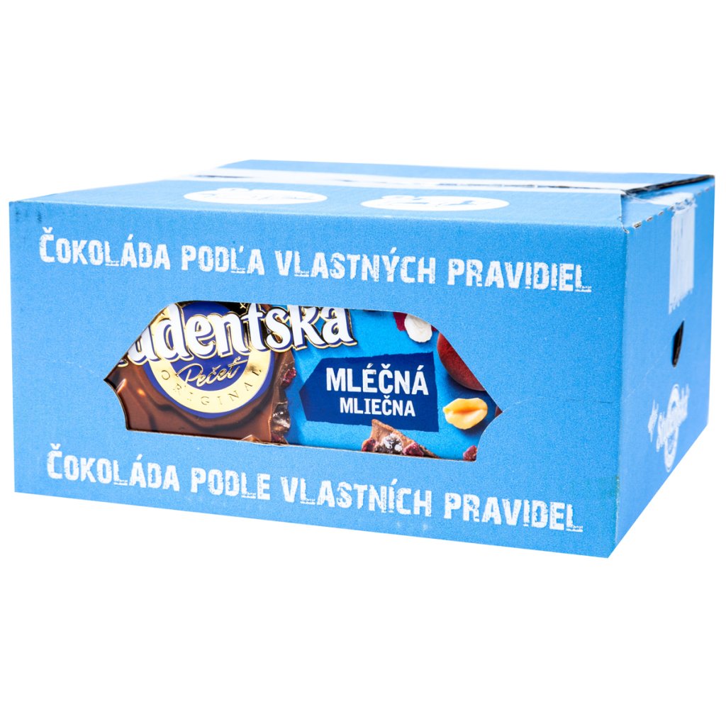 - Mléčná čokoláda 64 % s arašídy 12 %, želé 12 % a kousky s chutí višní 12 %.