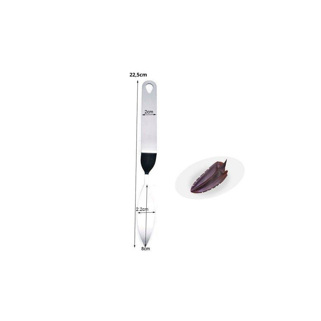 Cukrářská špachtle na výrobu čokoládových ozdob. Delková délka: 22,5 cm Délka čepele: 8 cm Šířka čepele: 2,2 cmDoplňkové parametry