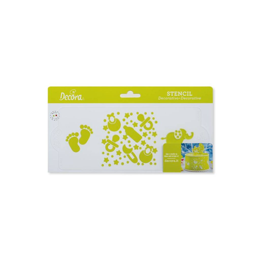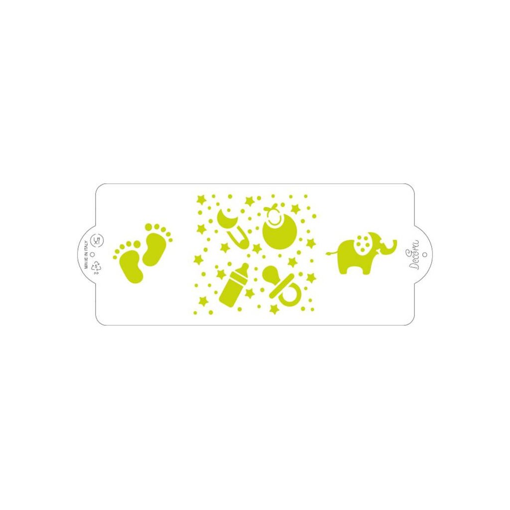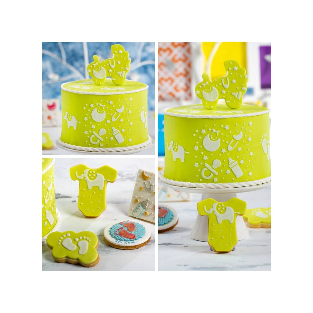 Rozměr: 10 x 25 cm Použití: Stencilu přiložíme na potahovací hmotu a přetřeme ji buď polevou Royal icing nebo prachovou barvou. Též lze použít nástřik pomocí sady Airbrush nebo barvy ve spreji. Při aplikaci nesmíme šablonou pohnout. Pak ji z hmoty sundáme.Doplňkové parametry