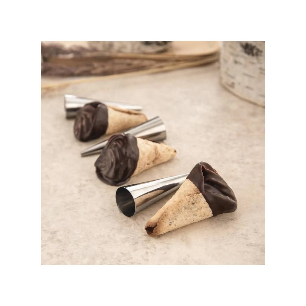 Křupavé upečené kornoutky, které stáhnete z lehce pomaštěné nerezové formy ještě za tepla, můžete po vychladnutí plnit sladkými sněhovými, smetanovými nebo máslovými krémy. Zkuste i slanou šunkovou, lososovou pěnu nebo jiné pikantní náplně. To se perfektně hodí na narozeninové oslavy nebo Silvestr. A kdo chce experimentovat, může např. tvarohovou směs nalít do formičky s dřevěnou nebo plastovou tyčkou a vložit do mrazáku. Vyrobí si osvěžující domácí nanuk. Materiál: nerezová ocel Výška: 8,5 cm Průměr: 2,5 cmDoplňkové parametry