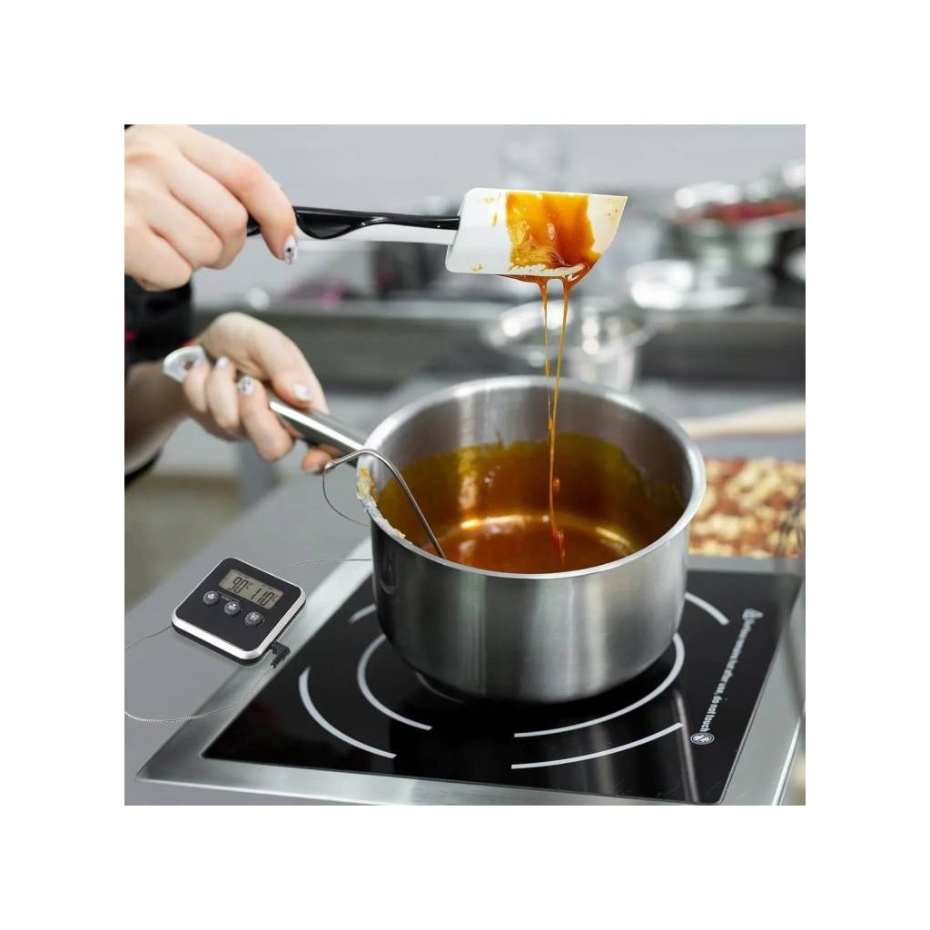 Kuchyňský digitální teploměr se sondou a kuchyňská minutka v jednom je skvělý pomocník nejen při přípravě masa. Využít jej můžete při grilování, pečení masa v troubě, při uzení v udírně, chlazení potravin v lednici, při vaření džemů, sirupů, karamelu apod. Vlastní tělo teploměru z ABS plastu je doplněno kovovým lankem o délce 93 cm, na jehož konci je 16 cm jehla s hrotem z nerezu s/s 304. Tento senzor měří teplotu hluboko uvnitř. Ať už pečete velký kusa hovězího masa, např. nízký roštěnec, vepřovou pečeni, roastbeef nebo jehněčí. teploměr umožňuje nastavit teplotní alarm při dosažení požadované teploty, jakmile teplota pokrmu dosáhne zvolené teploty, ozve se zvukový signál můžete zvolit režim minutky, které klasicky odpočítá nastavený čas a o jeho konci vás informuje zvukový signál možnost nastavení jednotky teploty v °C nebo v °F rozsah měření teploty od -20 °C do +300 °C rozsah časovače 99 min 59 sec Možnost zavěšení, postavení pomocí stojánku nebo přichycení magnetem na zadní straně teploměru. To využijete v momentě, kdy nepotřebujete jednorázově kontrolovat aktuální teplotu, ale teploměr umístíte na přední, kovovou plochu trouby. Lanko se senzorem zapíchnete do masa a necháte jej uvnitř troubyza zavřenými dvířky. Klidně po celou dobu pečení. Návod je součástí výrobku. Přepínač časovače a měření teploty najdete na zadní straně teploměru (COOK/TIMER). Napájení 1x 1,5V AAA baterie (není součástí). Rozměr: 8 x 8 cmDoplňkové parametry