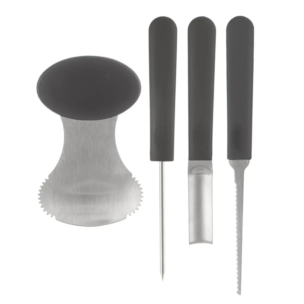 Sada 4 kusů vykrajovačů slouží k vyřezávání dýní, melounů a jiného ovoce a zeleniny. Obsahuje širokou dlabací špachtli, dlátko, pilku a kulatou tenkou špičku.