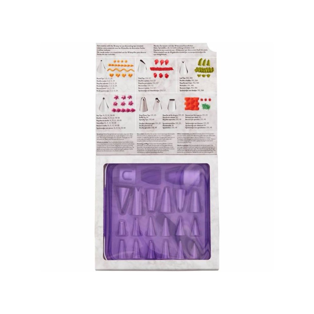 V sadě najdete 18 vysoce kvalitních špiček: Hladké - č. 3, 6, 12, 2A Řezané - 16, 21, 32, 1M, 4B Okvětní lístky a bordury - 104,127 Lístky a bordury - 352, 366 Hvězda, květina, volán, víceotvorová a košík - 129, 2D, 86, 233, 48 Sada dále obsahuje 24 pevných 30 cm sáčků, 22,8 cm dlouhou prohnutou paletu a Twist Quick adaptér. Odolné úložné pouzdro s uzamykatelným víkem umožňuje bezpečné uložení pomůcek.Doplňkové parametry