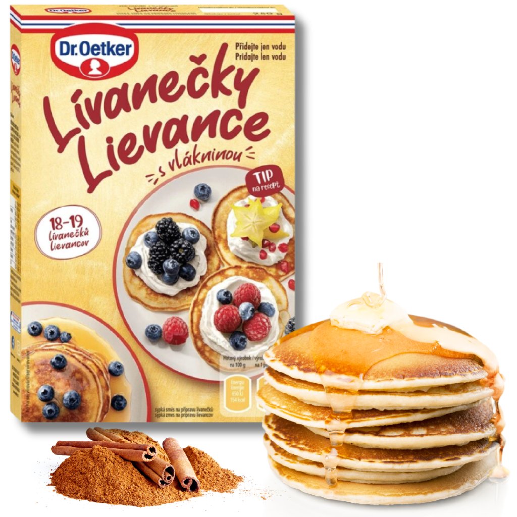 - příprava: 300 g směsi na přípravu těsta, 360 ml studené vody. Obsah sáčku vysypeme do misky a přidáme 360 ml vody. Směs metličkou důkladně rozšleháme na hladkou hmotu bez hrudek. Těsto necháme asi 5 minut odstát. Na rozehřátou lívancovou pánev potřenou olejem nalijeme těsto a opečeme po obou stranách do zlatova. Hotové lívanečky můžeme obalovat ve skořicovém cukru Dr.Oetker.