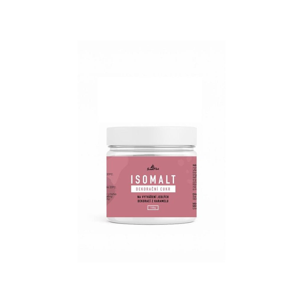 Dekorační cukr isomalt v perličkách na vytváření litých, modelovaných, tažených nebo foukaných jedlých dekorací z karamelu. Při dodržení výrobního postupu vzniká nezaměnitelný efekt lesklého skla. Možno rozpouštět bez přidání vody. Po roztavení lze barvit (nejlépe gelovými barvami) a ochucovat ovocnými pastami, případně lze obarvit již hotovou dekoraci sprejem nebo práškovými barvami. Jednou zpracovaný isomalt je možné znovu tavit. Aby se zabránilo jeho křehnutí v důsledku ztráty vnitřní vlhkosti, postačí přidat několik kapek vody. Použití: Perličky isomaltu rozopuštíme v hrnci dokud nezmizí všechny vzduchové bublinky, aniž bychom přidávali vodu nebo jiné ingredience. Nádobu s rozpuštěným isomaltem chladíme ve studené lázni, a při tom přidáváme na 1 kg isomaltu cca 10 ml vody, kterou můžeme v této fázi obarvit. Po zchlazení nalijeme hmotu na modelovací silikonovou podložku a můžeme začít modelovat pod lampou. Jednou zcela rozpuštěné perly mohou být rozehřáty opakovaně. Pokud však rozehříváme hmotu příliš často, příliš dlouho nebo při teplotách přes +150°C, výrobek bude výrazně křehčí. Při opakovaném rozehřívání proto doporučujeme přidat opět několik kapek vody.Složení, co obsahuje produkt - SweetArt Dekorační cukr Isomalt 150 g pro cukrářské účely: