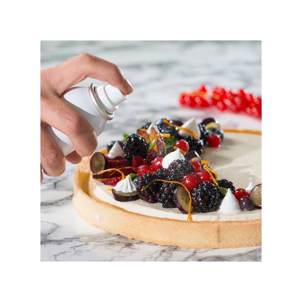 Tento sprej umožňuje pokrýt cukrářský produkt stejnoměrnou a tenkou vrstvou želatiny. Složení: voda, glukózový sirup, zahušťovadlo agar-agar, regulátor kyselosti kyselina citronová, konzervant sorban draselný Nutriční hodnoty ve 100 g: energie 743 kJ/175 kcal, tuky 0 g (z toho nasycené 0 g), sacharidy 43,5 g (z toho cukry 19 g), vláknina 0,4 g, bílkoviny 0 g, sůl 0 gDoplňkové parametry