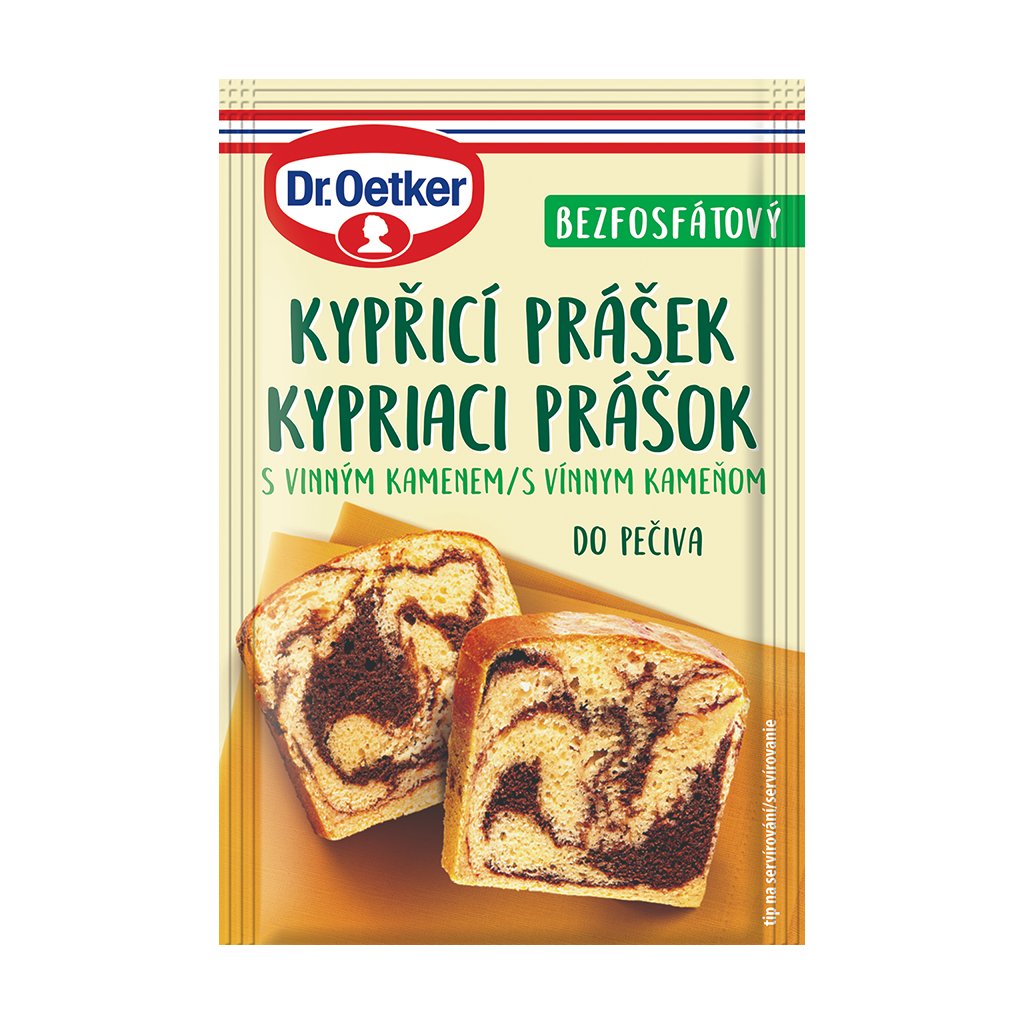 - Kypřicí prášek s vinným kamenem rozmícháme v mouce a přidáme do těsta jako běžný kypřicí prášek do pečiva. Bábovka Těsto: 350 g polohrubé mouky, 1 Kypřicí prášek s vinným kamenem Dr. Oetker, 240 g cukru, 1 Vanilínový cukr Dr. Oetker, 2 vejce, 250 ml mléka, 125 ml oleje. Mouku smícháme s kypřicím práškem s vinným kamenem. Přidáme cukr, vanilínový cukr, vejce, mléko a olej. Vše metličkou důkladně vymícháme dohladka. Těsto nalijeme do vymazané a moukou vysypané formy na bábovku. Pečeme v předehřáté el.troubě při 160 °C asi 45 minut.