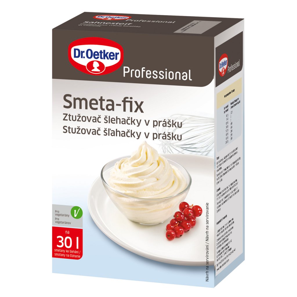 - 1. Odměřené množství dobře vychlazené smetany ke šlehání vlijte do vhodné nádoby a šlehejte přibližně 1 minutu.2. Za stálého šlehání postupně přisypávejte odpovídající množství směsi Smeta-fix.3. Vyšlehejte do požadované tuhosti a před servírováním nechte dobře vychladit.