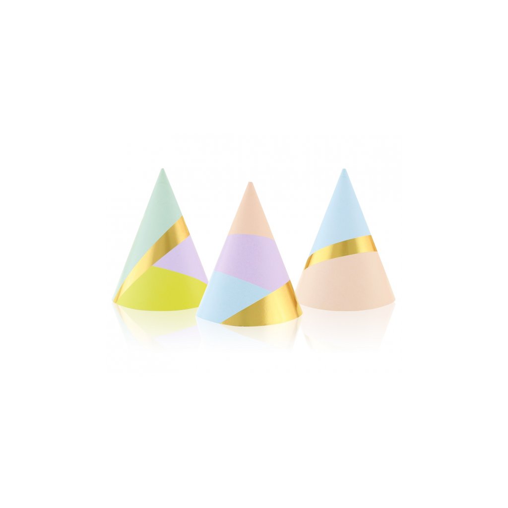 Papírové čepičky v pastelových barvách lemovaných zlatem, v balení po 6ti kusech. Hodí se na oslavu narozenin tematickou party nebo karneval. Tímto jednoduchým party doplňkem, dotáhnete každou oslavu k dokonalosti. Počet: 6 ks.Doplňkové parametry