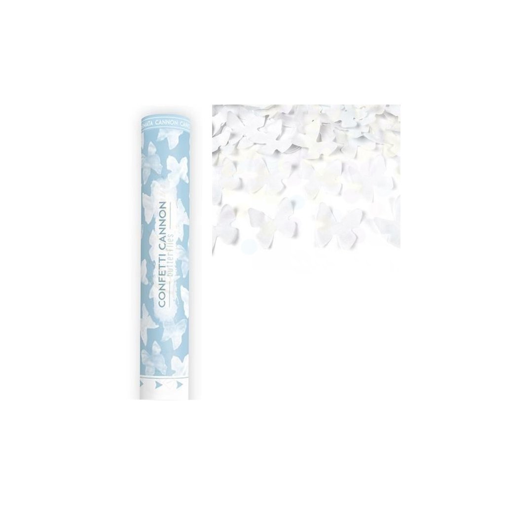 Vystřelovací konfety - bílí motýli - 60 cm. Vystřelovací konfety, jsou skvělý prostředek k vytvoření wow efektu. Hodí se na jakoukoliv oslavu jako jsou oslavy narozenin, svatby, odhalení pohlaví miminka nebo silvestr. Tímto jednoduchým party doplňkem, dotáhnete každou oslavu k dokonalosti. Vystřelují do výšky až 7 metrů. Barva: bílá Velikost: 60 cm. Balení: 1 ks. Video s návodem k použití efektem naleznete pod tímto odkazem.Doplňkové parametry