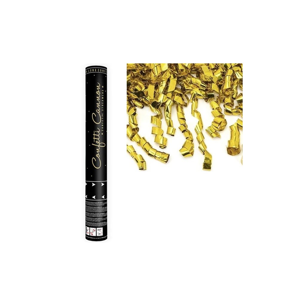Vystřelovací konfety - zlaté serpentiny 60 cm. Vystřelovací konfety, jsou skvělý prostředek k vytvoření wow efektu. Hodí se na jakoukoliv oslavu jako jsou oslavy narozenin, svatby, odhalení pohlaví miminka nebo silvestr. Tímto jednoduchým party doplňkem, dotáhnete každou oslavu k dokonalosti. Video s návodem k použití efektem naleznete pod tímto odkazem. Velikost: 60 cm. Balení: 1 ks.Doplňkové parametry