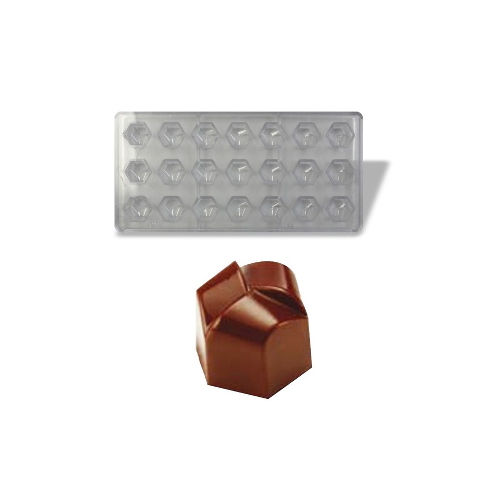 Pevná obdélníková polykarbonátová forma 3x7 tvarů na výrobu čokoládových pralinek.