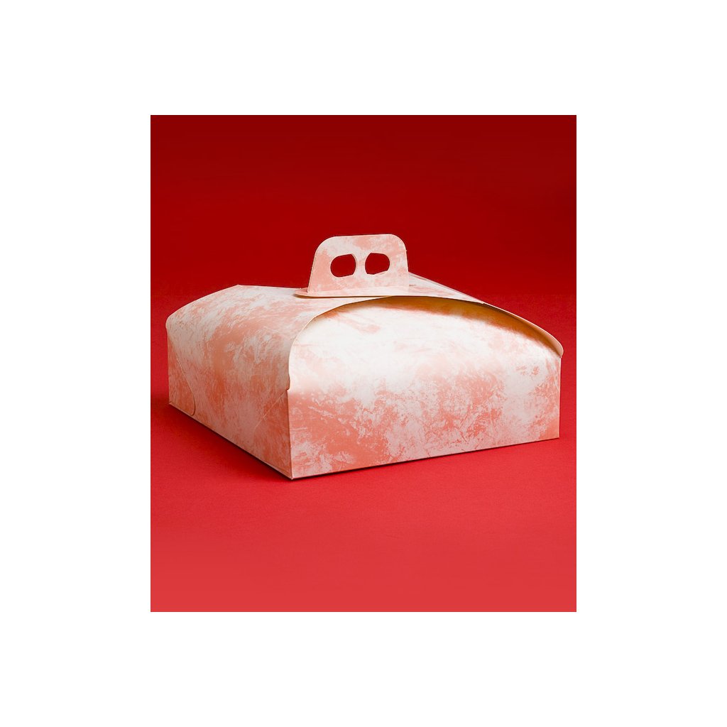 Elegantní čtvercová krabice na dorty z lesklého papíru s růžovým dekorem. Velmi dobře se přenáší.