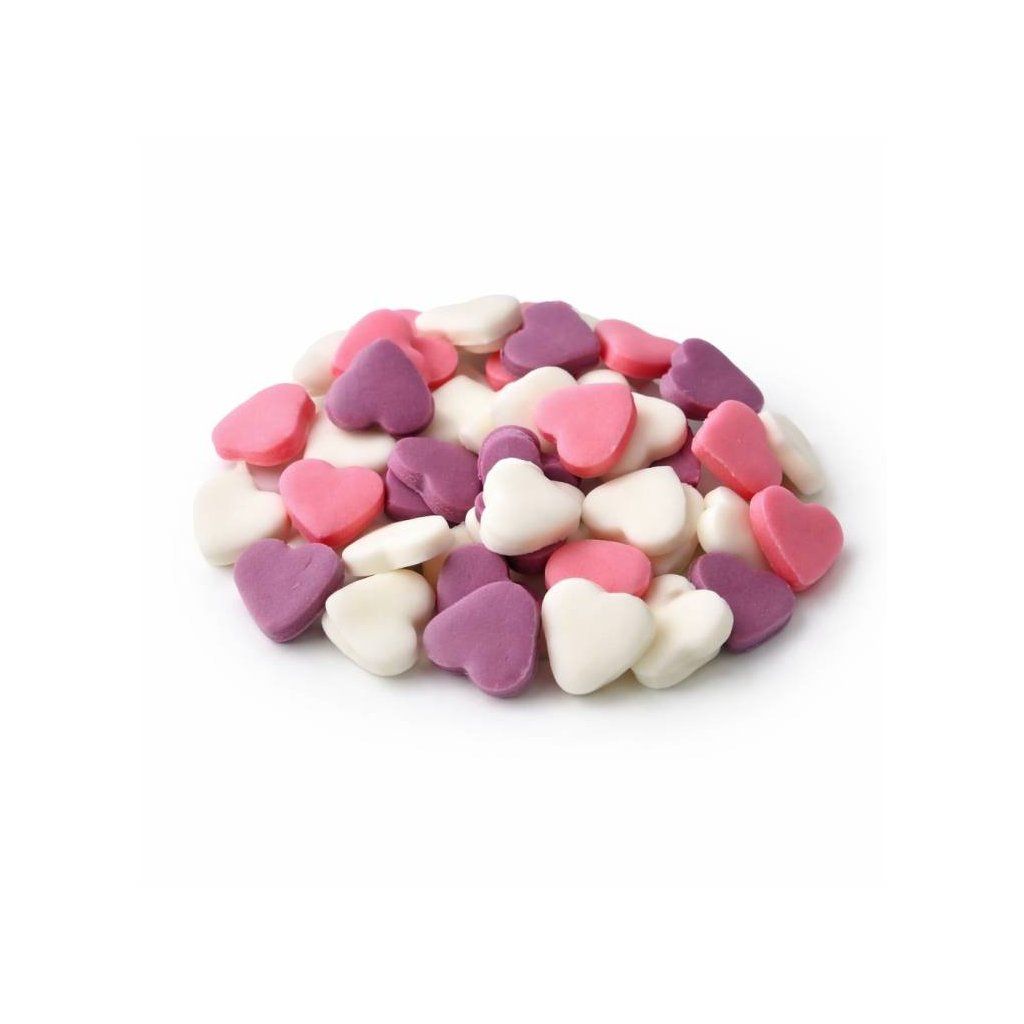 Cukrová srdíčka malá bílá, růžová a fialová (50 ks) ▹