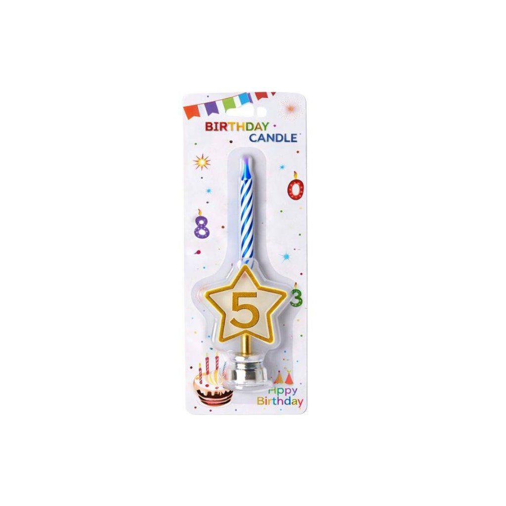 Svíčka modrá s LED zlatým podstavcem ve tvaru hvězdy číslo 5 ▹