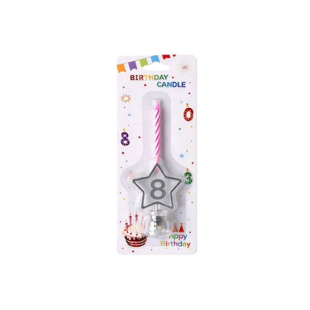 Svíčka růžová s LED stříbrným podstavcem ve tvaru hvězdy číslo 8 ▹