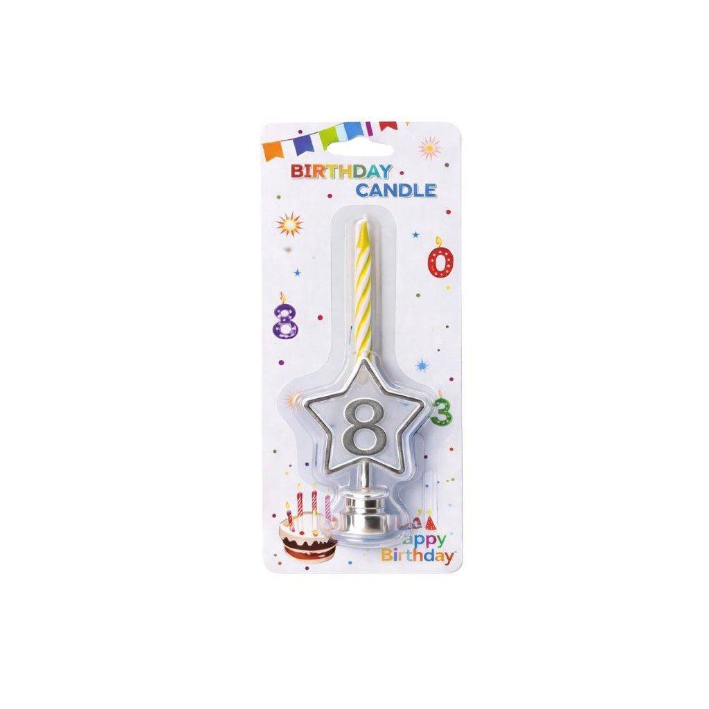 Svíčka žlutá s LED stříbrným podstavcem ve tvaru hvězdy číslo 8 ▹