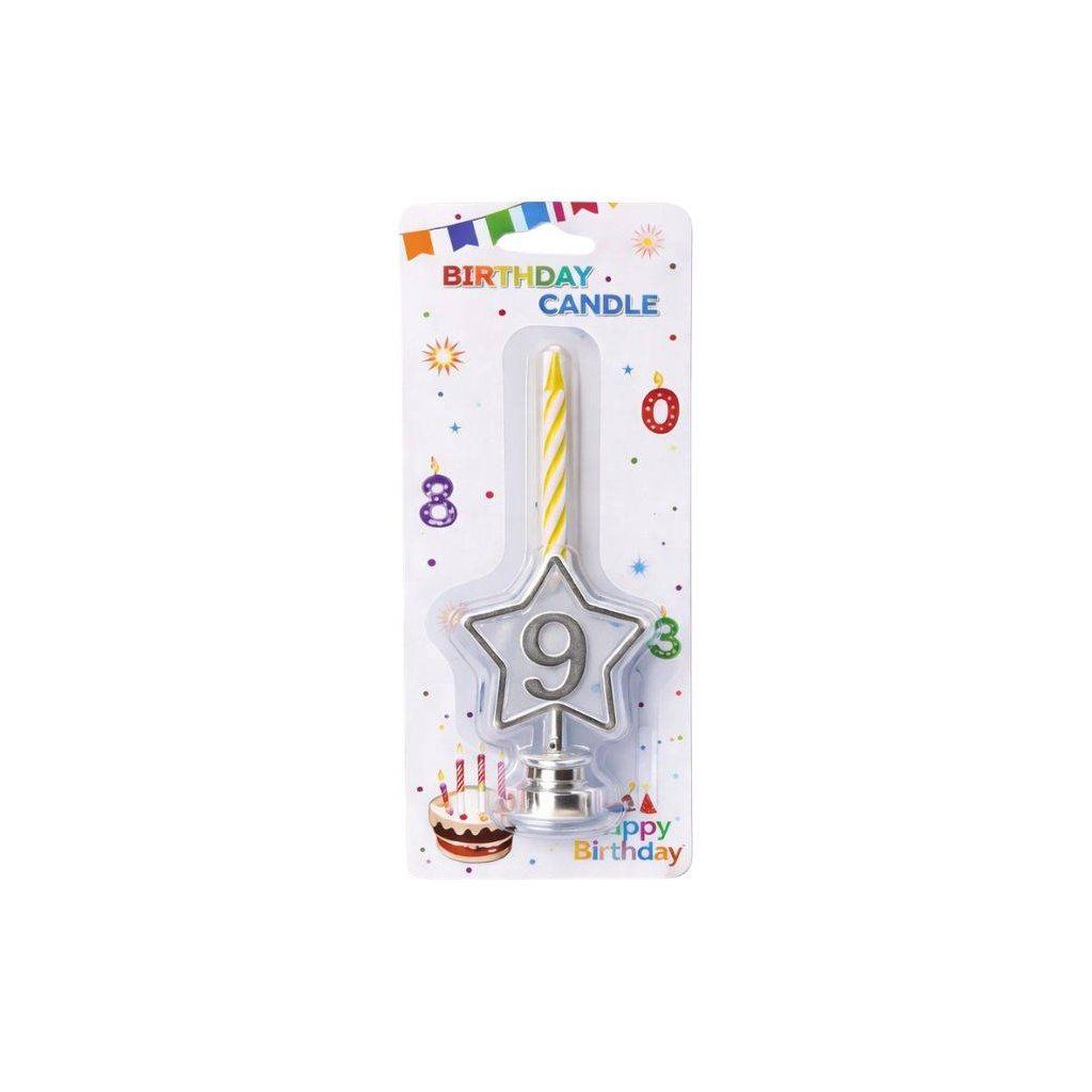 Svíčka žlutá s LED stříbrným podstavcem ve tvaru hvězdy číslo 9 ▹