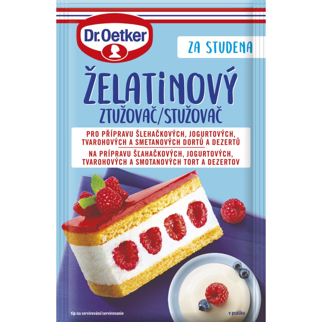 - Odpovídá 6 plátkům želatiny, vystačí až na 700 g hmoty, např. vyšlehaná smetana ke šlehání, zakysaná smetana, jogurt, tvaroh, rozmačkané ovoce, ovocná dřeň apod. Příprava: 1. Smetanu ke šlehání vyšleháme dotuha, jiné výše uvedené suroviny zamícháme dohladka. 2. Obsah sáčku nasypeme do větší misky, přidáme 100 ml vlažné vody a ručně metličkou intenzivně mícháme asi 1/2 min. Ihned po částech přidáme šlehačku nebo jiné předem připravené suroviny. Důkladně ručně vařečkou nebo metličkou promícháme. Podle chuti dosladíme a dochutíme. 3. Krém naneseme na upečený korpus nebo použijeme dle vlastního receptu. Necháme ztuhnout v chladničce (asi 2 hodiny). Nepoužívejte s čerstvým ananasem, kiwi, fíky a papájou. Tip na Ovocný jogurtový dezert: 500 g bílého jogurtu smícháme se 100 g drobného ovoce nakrájeného na malé kousky a 50 g - 70 g moučkového cukru (podle sladkosti ovoce). Želatinový ztužovač připravíme s vodou podle bodu 2 návodu na obale a smícháme s jogurtem a ovocem. Nalijeme do formy na biskupský chlebíček nebo jiné formy vyložené potravinářskou fólií a necháme ztuhnout v chladničce (asi 2 hodiny). Před podáváním vyklopíme a nakrájíme na plátky.