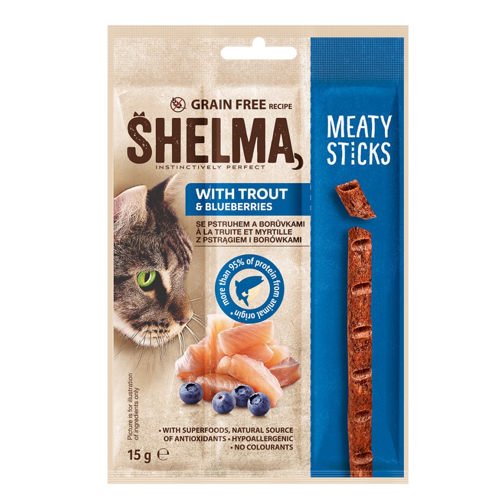 - Shelma snack GF kočka mas. tyčinky pstruh 15g