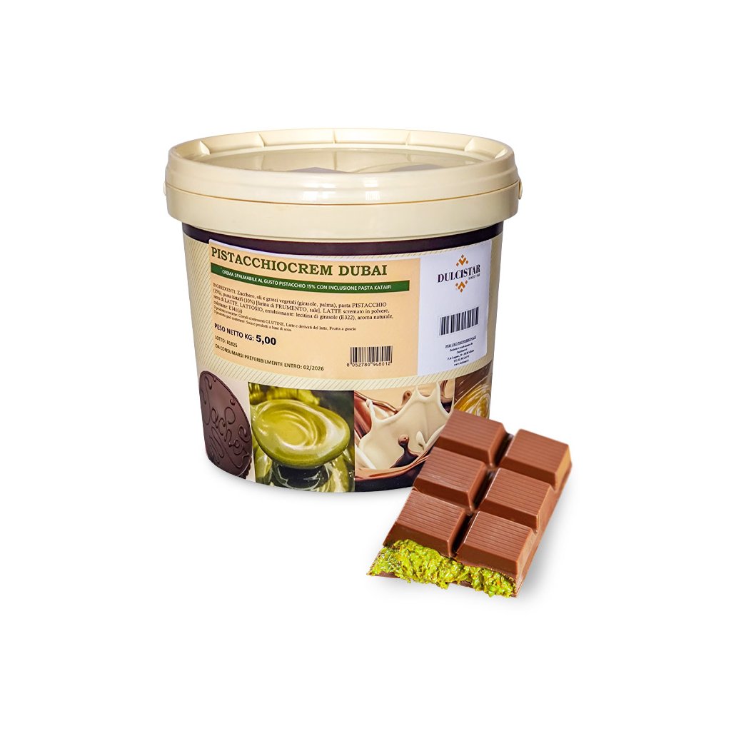 Hotový snadno roztiratelný krém s vysokým podílem italských pistácií (15 %) a přidáním křehkého těsta kataifi. Ideální především na výrobu nejkvalitnější naplní do pravé dubajské čokolády. Kataifi vytváří jedinečnou strukturu, jež obohacuje intenzivní pistáciovou chuť.