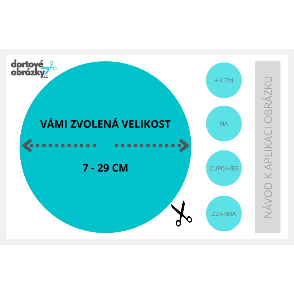 - V případě zvolení velikosti 12-20 cm ve tvaru kruhu, obdržíte dekorace na cupcakes, nebo na bok dortu o průměru cca 4,4 cm a to dle volné kapacity listu papíru. Počet dekoračních koleček je 2-6 dle volného prostoru na listu. Další kolečka na cupcakes lze přiobjednat. Dekorační kolečka zdarma, nejsou poskytovány u dortových obrázků mimo uvedený rozměr.