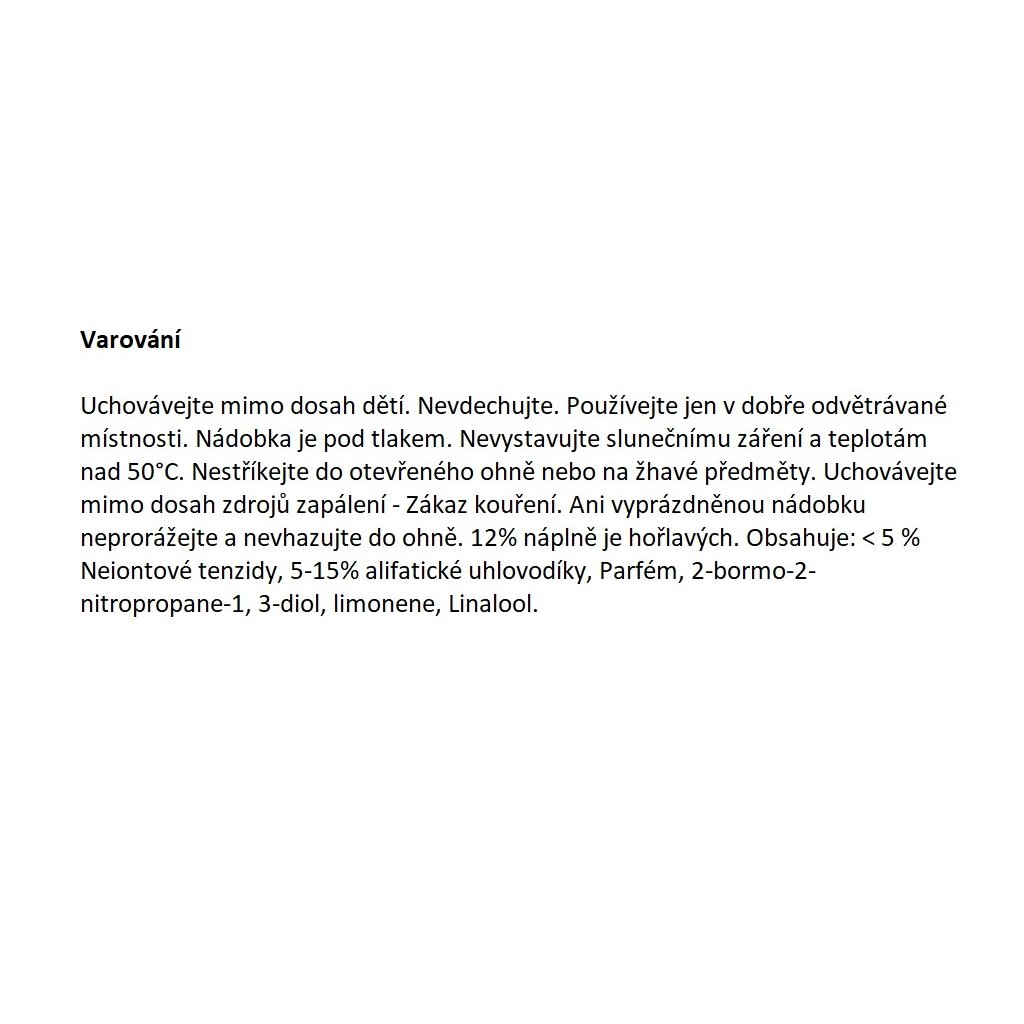 | Upozornění o hořlavosti a toxických chemických látkách: | Varování: vždy si prostudujte popisnou etiketu obalu, všechny námi nabízené výrobky jsou opatřeny českým popisem |