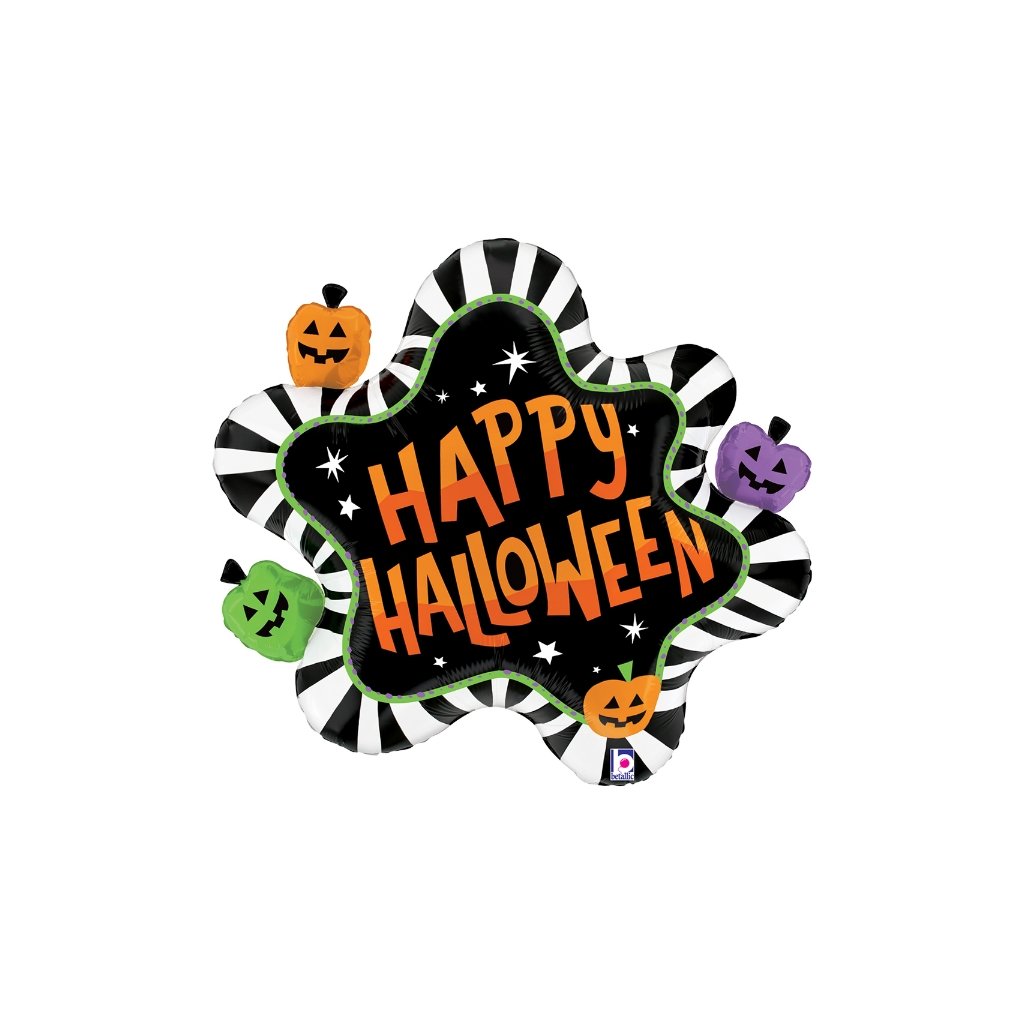 Oživte svou halloweenskou výzdobu výrazným fóliovým balonkem Happy Halloween Striped Splat. Tento originální balonek kombinuje černo-bílý pruhovaný design s barevnými dýněmi v oranžové, zelené a fialové barvě. Díky svému velkému rozměru 79 cm se stane dominantou každé halloweenské oslavy. Balonek je ideální jako samostatná dekorace, součást balónkové girlandy nebo tematického fotokoutku. Lze jej nafouknout vzduchem i héliem, a díky samo uzávěru se snadno plní a vydrží plně nafouknutý několik dní. Rozměry po nafouknutí: cca 79 × 69 cmObjem balonku: cca 83 lMateriál: metalická fólieSamo uzávěr: AnoObchodní balení: AnoBalení: 1 ksDoplňkové parametry