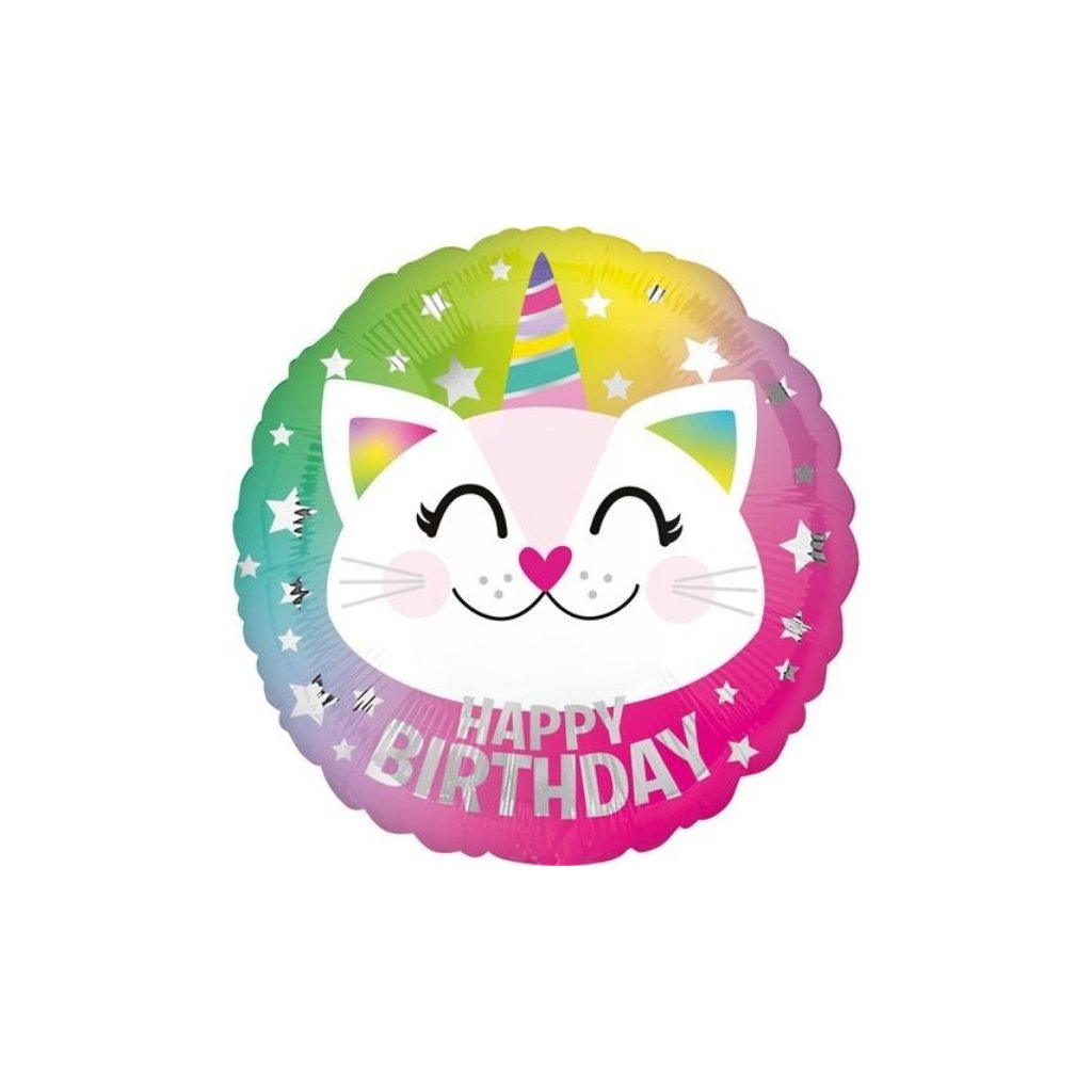 Foliový balonek kulatý barevný s kočičkou a nápisem Happy Birthday na tématickou party s kočičkami, bude ideální dekorací tématické party nebo dívčí oslavy narozenin. Vhodný pro nafukování vzduchem i heliem. Rozměry: 43 cm. Balení: 1 ks.Doplňkové parametry