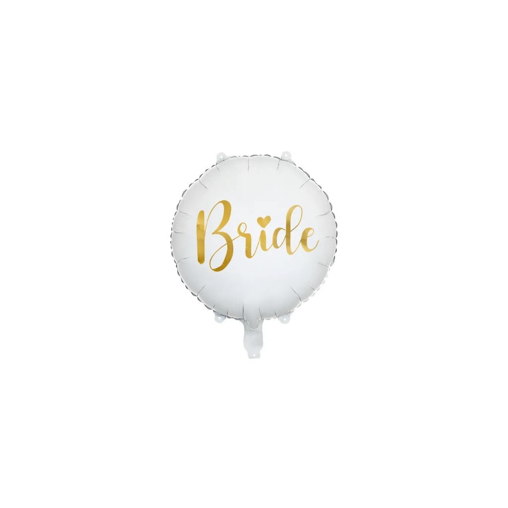 Foliový balonek kulatý bílý se zlatým nápisem Bride. Vhodný na rozlučku se svobodou, hodí se ale i na svatební dekoraci nebo jej přivažte jednoduše k židli , jako označení pro nevěstino místo u stolu. Balonek lze nafouknout vzduchem i heliem. Nafouklý heliem vydrží 3-5 dní plně nafouklý. Velikost: 45 cm.Doplňkové parametry