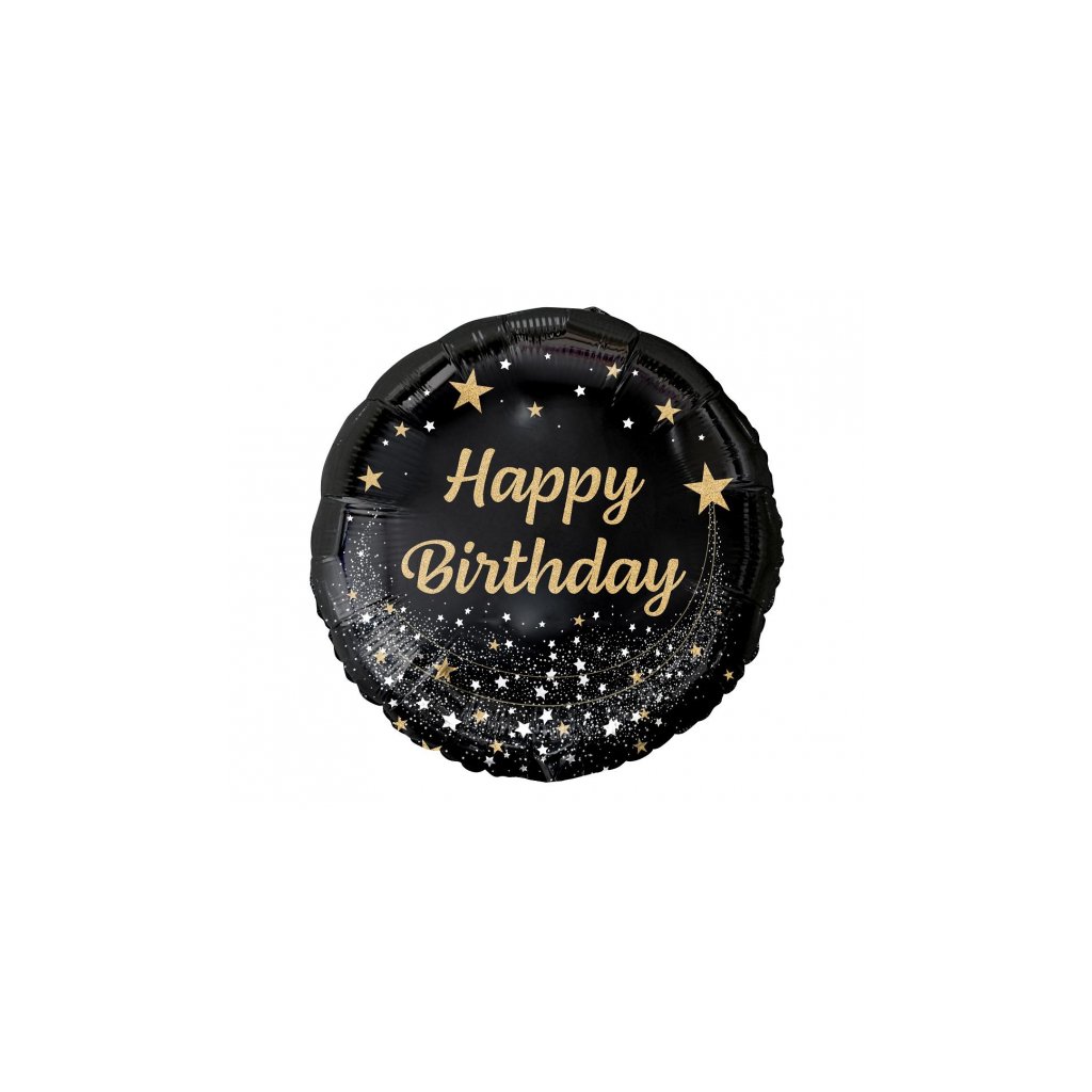Foliový balonek kulatý v černé barvě a se zlatým nápisem "Happy Birthday", který můžete použít například jako dekoraci při oslavě nebo jako dárek pro oslavenkyni. Velikost: 45 cm. Balení: 1 ks.Doplňkové parametry