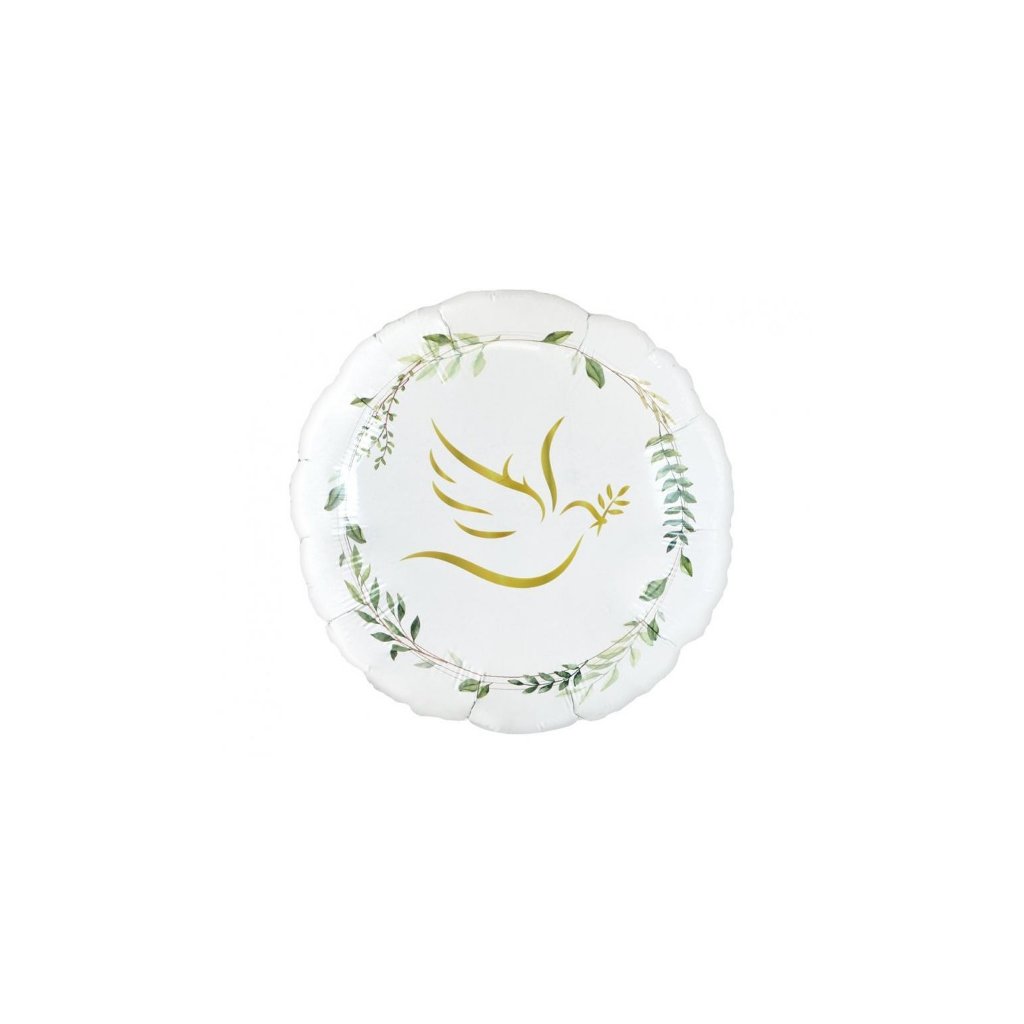 Foliový balonek kulatý - Holubice s listy - 46 cm. Tento balónek je perfektní dekorační doplněk na oslavu narozenin nebo jako výzdoba party. Hodí se také jako malý dárek nebo na dekoraci při svatbách, křtinách. Balonek lze nafouknout vzduchem i heliem. Při nafouknutí heliem vydrží plně nafouklý cca 3 až 5 dní, poté se začne pomalu vyfukovat. Balonek je vyroben z recyklovatelných materiálů a je 100% recyklovatelný. Velikost: 46 cm Balení: 1 ks.Doplňkové parametry