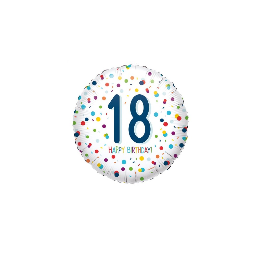 Foliový kulatý balonek potištěný barevnými konfetami, nápisem Happy Birthday a číslem 18. Balonek je vhodný pro plnění vzduchem i heliem. Při nafouknutí heliem vydrží v plném stavu 3 až 5 dní, poté se začne pomalu vyfukovat. Rozměry: 43 cm. Balení: 1 ks.Doplňkové parametry