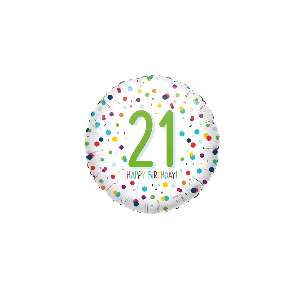 Foliový kulatý balonek potištěný barevnými konfetami, nápisem Happy Birthday a číslem 21. Balonek je vhodný pro plnění vzduchem i heliem. Při nafouknutí heliem vydrží v plném stavu 3 až 5 dní, poté se začne pomalu vyfukovat. Rozměry: 43 cm. Balení: 1 ks.Doplňkové parametry