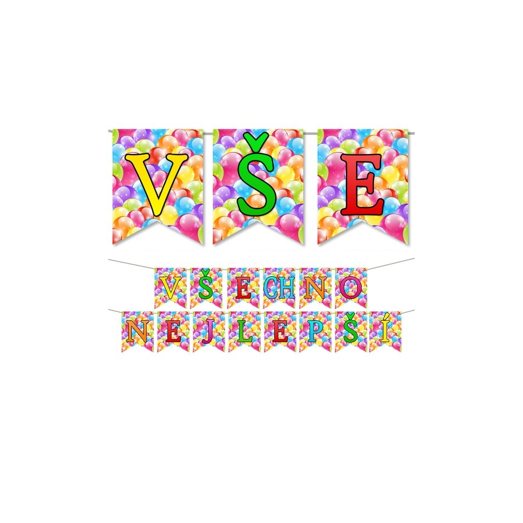 Papírová vlaječková girlanda s nápisem Všechno nejlepší. Girlanda obsahuje papírové vlaječky s písmeny které tvoří nápis Všechno nejlepší. Délka: 340 cm Výška: 23 cm Balení: 14 vlaječek + stuha Rozměr jedné vlajky: 23 x 18 cm Vyrobena s láskou v České republice.Doplňkové parametry