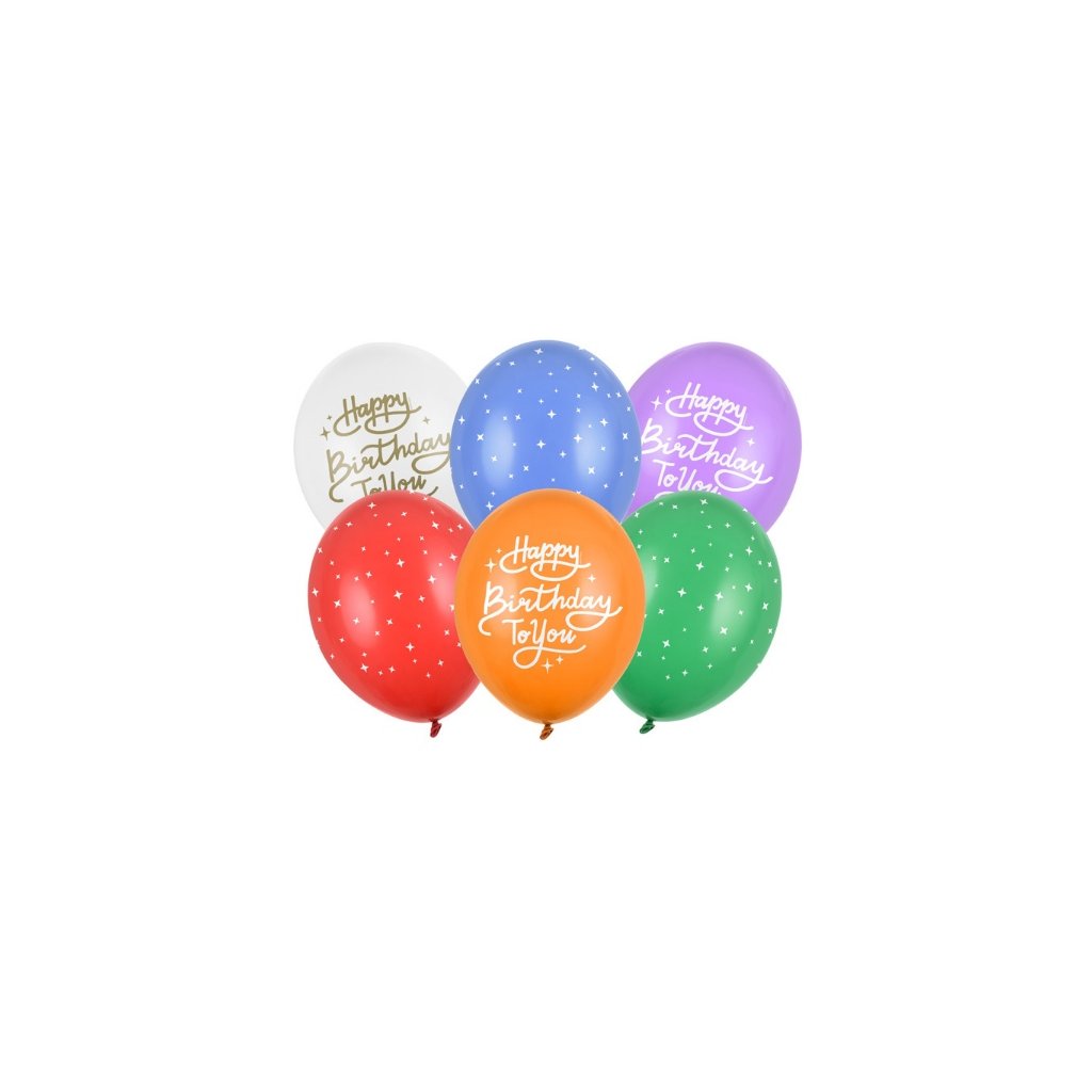 Latexové balonky s nápisem Happy Birthday To You, jsou celoplošně potištěné a dodáváme je ve velikost 30 cm. V balení 1x balonek bílý se zlatým potiskem, poté 5x balonek různé barvy s bílým potiskem. Balonek je vhodný pro nafukovaní vzduchem i heliem. Délka letu při nafukování héliem je cca 12 hodin. Velikost: 30 cm. Balení: 6 ks.Doplňkové parametry