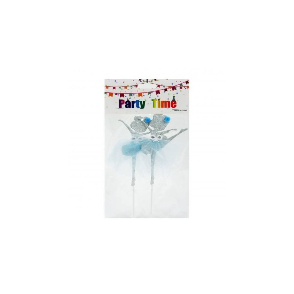 Zápich do dortu Baletky s bambulkou stříbrné s modrou sukní (2 ks) ▹