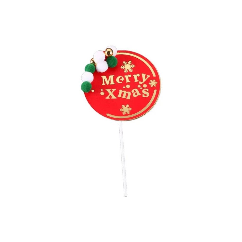 Zápich do dortu červený Merry Xmas s plyšovými bambulkami ▹
