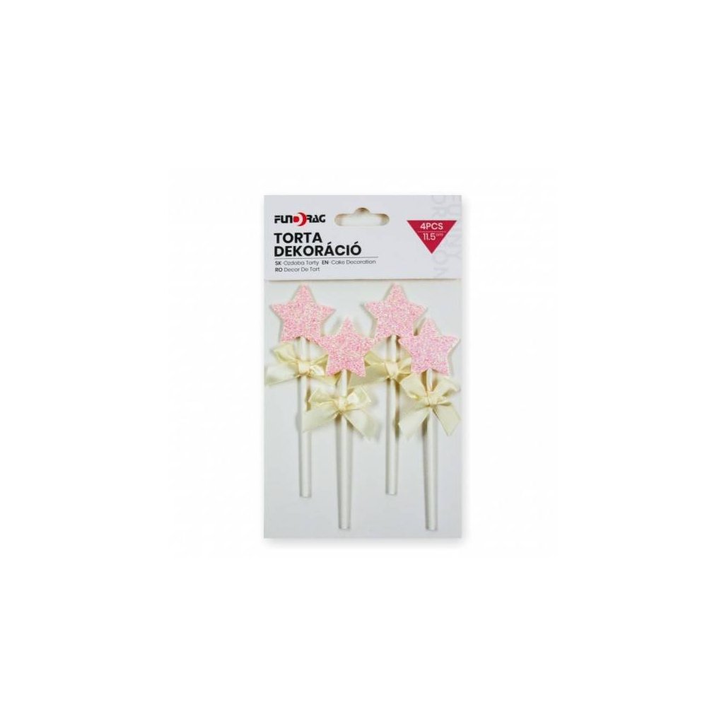 Dodejte svému dortu jemný a roztomilý vzhled! Tato sada čtyř růžových hvězdiček zdobených béžovými mašličkami je perfektní pro dětské oslavy, narozeniny, křtiny nebo tematické párty v pastelových barvách. Výška hvězdičky: 11,5 cm (3,2 cm bez zapichovací části)Doplňkové parametry