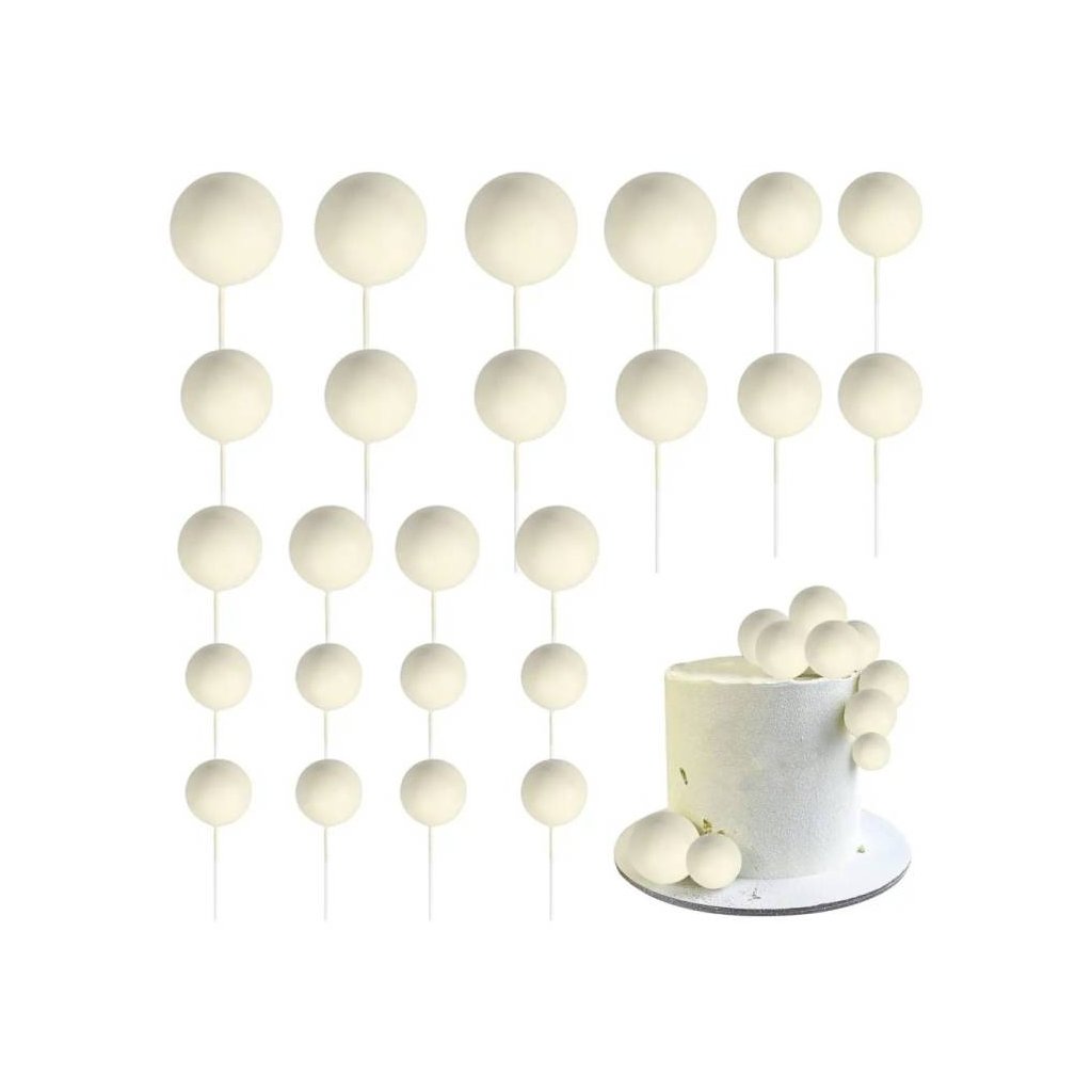 Dodejte svému dortu moderní a originální vzhled s touto sadou zapichovacích dekorací ve tvaru koulí. Různorodé velikosti vytvářejí zajímavý 3D efekt, který upoutá pozornost na každé oslavě. Rozměry: 2 - 4 cmDoplňkové parametry