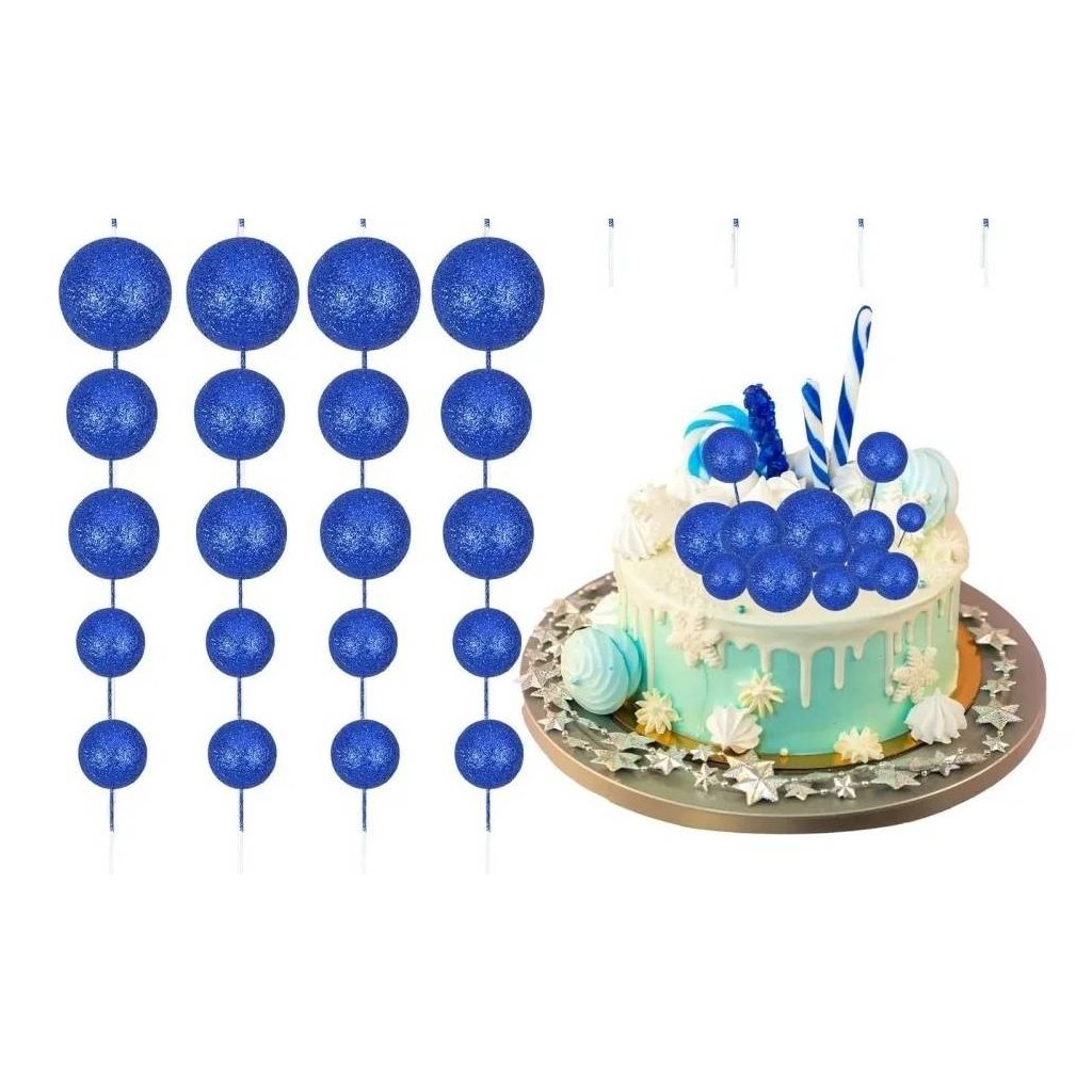 Zápich do dortu Koule modré glitterové různé velikosti (20 ks) ▹