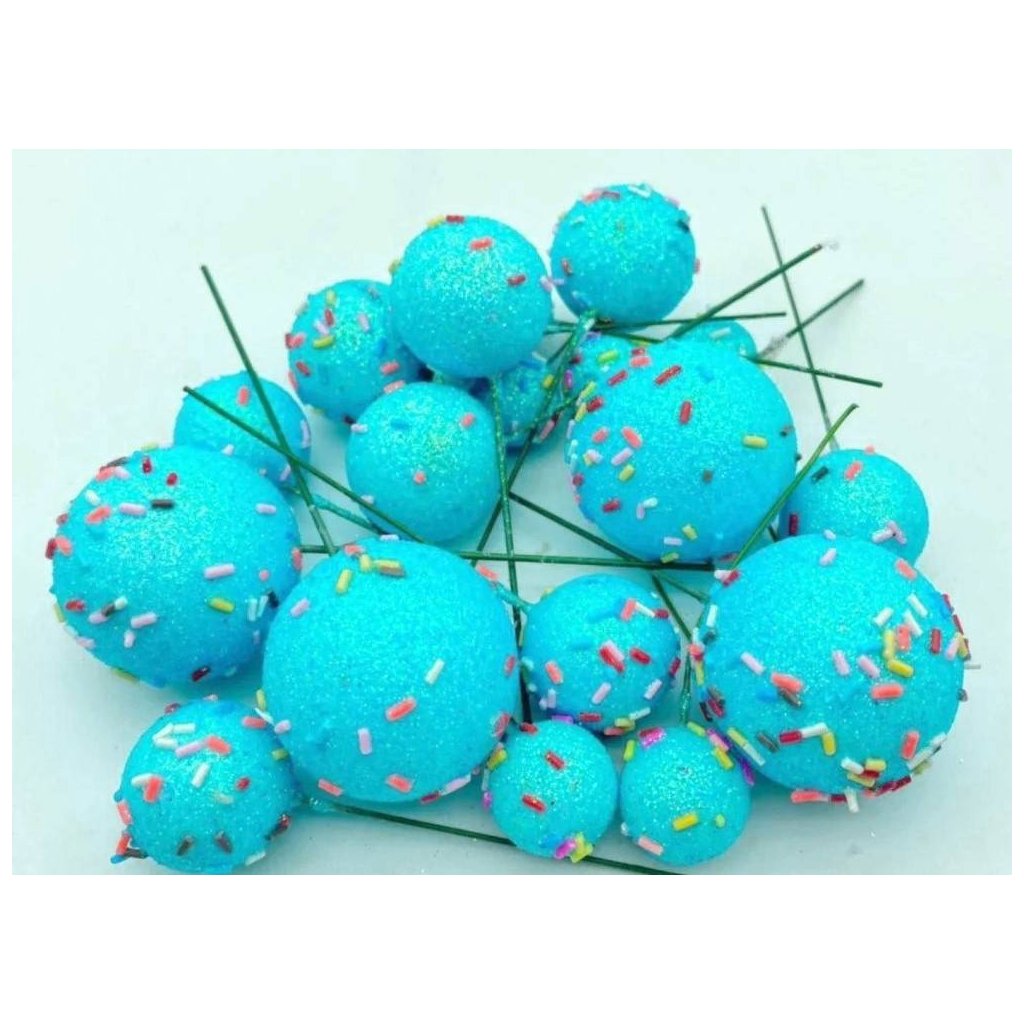 Zápich do dortu Koule modré glitterové s ozdobami různé velikosti (20 ks) ▹