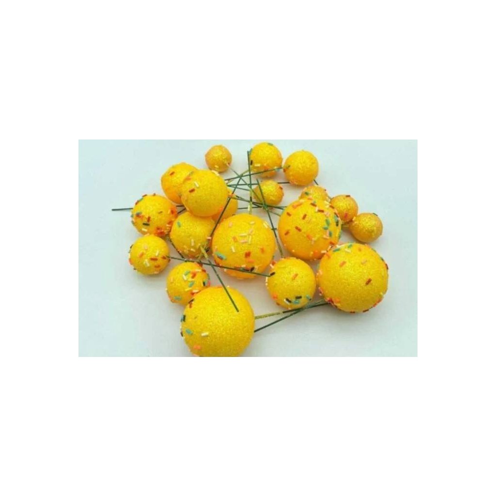 Zápich do dortu Koule žluté glitterové s ozdobami různé velikosti (20 ks) ▹