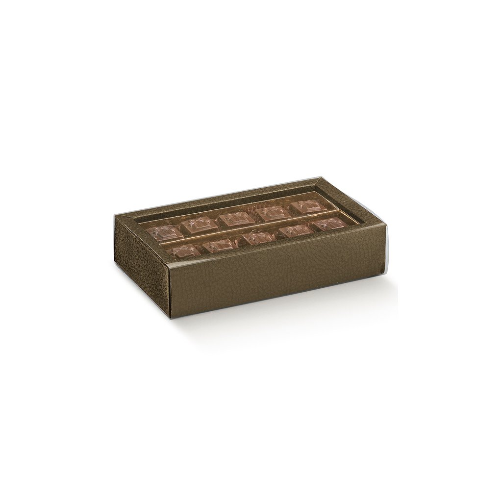 Velice elegantní papírová krabička na pralinky v hnědé barvě s jemným reliéfním vzorem imitace kůže. Dodáváno s průhledným plastovým obalem.